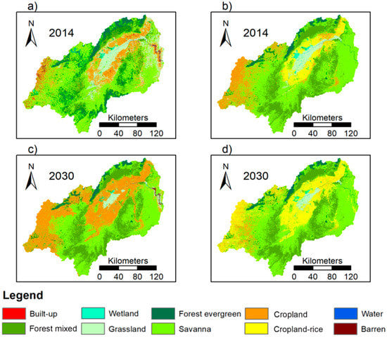 Land use and land cover classifications as modeled by the Land Change Modeler for the year 2030. For better comparison (a,b) show the setups for 2014 from Figure 2, (c) displays the scenario based on the single cropland classification and (d) illustrates the same scenario but distinguishes between cropland and cropland-rice land use class.
