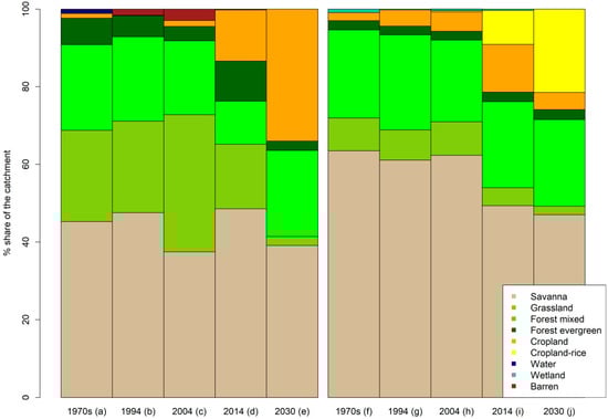 For the analyses on subcatchment scale (Figures 10 and 12) the LULC setup of 1994 was used for the comparison instead of the setup of 1970. This was done because the setup of 2030 was projected based on changes to the setup from 2004 to 2014. Baseline data for the generation of these setups are Landsat 5, 7 and 8 images. Their band definitions are similar with only negligible differences [72] and they all have the same resolution of 30 m. The 1970s setup is less suitable for comparison on subcatchment scale, since it was generated with pre-collection Level 1 60 m resolution data and conventional mosaicking [2]. The map from the 1970s is based on a decadal best pixel composite of images from different seasons and is therefore less consistent than the later maps, which are based on multi-seasonal multi-temporal metrics.