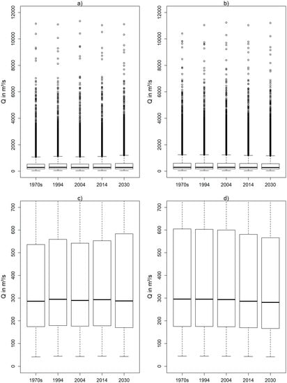 Additionally, the Q10 index was applied, because it is less sensitive to outliers compared to the generalized extreme value analysis. The Q10 is defined as the daily discharge that is exceeded in 10% of all the simulations here. Moreover, the Q90 [66,67] index was used to analyze low flows. In contrast to the Q10 index, the Q90 index is defined as daily discharge that is exceeded in 90% of all the simulations here. The Hydrostats package [68] in the statistical software R was applied for these analyses.