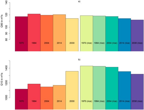 Figure 7 focuses on low flows (Figure 7a) and high flows (Figure 7b) for all setups. The general pattern for the low flows shows decreasing trends for the LULC setups including rice from the 1970s (Q90 of 119 m3/s) to 2030 (Q90 of 112 m3/s), which equals a drop of 6%. The cropland setups lack this trend, however the lowest Q90 value is again with the 2030 setup (114 m3/s). The values for Q10 show an analogous picture for the cropland-rice setup, with decreasing trends from the 1970s setup (1430 m3/s) to the 2030 setup (1320 m3/s). The absolute changes (110 m3/s) are more pronounced compared to the Q90 decrease, but the relative changes are comparable with 8%. The cropland setups show a different picture, with rather low absolute Q10 values from the 1970s (1118 m3/s) up to 2014 (1169 m3/s) and a sharp increase for the 2030 setup (1358 m3/s), which equals an increase of 21% compared to the 1970s setup.