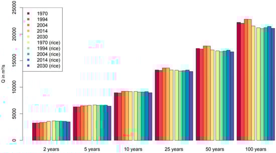 Figure 8 shows the discharge amount for return levels for all setups based on the GEV-GMLE analysis of 48 annual maximum values from the period of 1958 to 2005. The distribution is similar to the Q10 values presented in Figure 7b. The discharge of 2-year and 5-year return levels for the cropland setups increase from the 1970s setup (3260 m3/s; 6310 m3/s) to the 2030 setup (3566 m3/s; 6595 m3/s), whereas the cropland-rice setups show an opposing trend (1970s: 3655 m3/s; 6663 m3/s; 2030: 3472 m3/s; 6437 m3/s). These trends are overcome by increasingly high return level values for both 2004 and 2014 setups. Furthermore, the relation of increasing return levels for the comparison of the 1970s setup and the 2030 setup with cropland is inverted from the 25-year return level onwards.