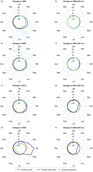 Figure 9 illustrates changes among LULC setups for selected water balance components, namely surface runoff, overall water yield and evapotranspiration on a monthly timescale for the whole simulation period from 1958–2005. All changes represent differences among the presented LULC setup and the basic setup from the 1970s. Hereby, all cropland setups (Figure 9a–d) are compared to the cropland 1970s setup and all cropland and cropland-rice setups (Figure 9e–h) are compared to the cropland and cropland-rice setup from the 1970s. Overall, the monthly changes are rather small, although water yield increases in the 2030 setup (Figure 9d) by an average of 22.3 mm per year in April, which equals 28.2% of the overall water yield for that month. Furthermore, evapotranspiration decreases nearly the whole year round (except for May and June) in that setup by up to 8.2 mm in average for the month of December, which equals 8.5% of the average evapotranspiration in that month. A different picture is shown for the rice scenarios (Figure 9e–h), where overall water yield decreases in the 2014 (Figure 9g) and 2030 (Figure 9h) setup for April and May. However, the average decrease ranges from 5.4 mm (5.1%; May, 2014 setup) to 8.1 mm (7.6%; May, 2030 setup) and is therefore less pronounced compared to the increases in the 2030 cropland setup.