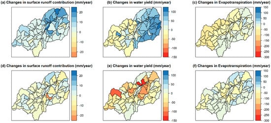 Average annual changes in selected water balance components on subcatchment scale. (a–c) compares the cropland LULC maps of 1994 and 2030, while (d–f) compares the cropland-rice LULC maps of 1994 and 2030 on. All model runs used identic climate data from 1958 to 2005 and differences in water balance components refer only to changes in LULC.