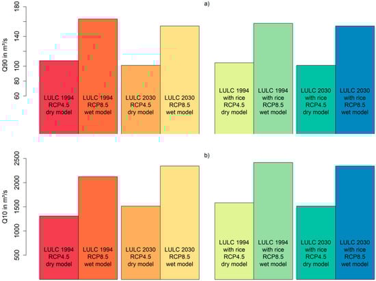 Bar plots showing the distribution of Q90 (a) and Q10 (b), representing the flow exceeded in 90% or 10% of the time for Q90 and Q10, respectively. The LULC setups of 1994 (cropland and cropland-rice) as well as the scenarios for 2030 (cropland and cropland-rice) are simulated with climate data of the period from 2010 to 2060 with the “dry” and the “wet” GCM-RCM model (Table 3).