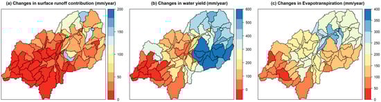 Variations of surface runoff, overall water yield, and evapotranspiration on subcatchment scale are shown in Figure 10. Figure 10a–c compares the annual water balance components’ averages from the 2030 setup with the 1994 setup with cropland and Figure 10d–f compares the same with the cropland-rice setups, respectively. An increase of surface runoff and overall water yield is apparent (Figure 10a,b). The northeastern parts, and also the floodplain show increasing surface runoff values of 10 to 20 mm and increase in total water yield of more than 50 mm. Hence, evapotranspiration is decreasing in nearly all subcatchments, especially in the mountainous northwestern parts. The differences in the rice setups (Figure 10d–f) from 1994 to 2030 show a different pattern. Changes in surface runoff are less pronounced and most subcatchments show a slightly decreasing trend. Overall water yield is decreasing in many subcatchments by 50 mm and more, especially in the fringe of the floodplain, but also in some of the northwestern mountainous subcatchments. Furthermore, evapotranspiration is decreasing in many subcatchments, especially on the fringe of the floodplain and the western parts. However, slightly increasing trends of evapotranspiration are apparent e.g., in the northeastern subcatchments.