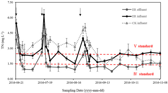 As shown in Figure 1, the TN concentration of the wastewater was greatly influenced by fertilization. The TN peak values were detected in the summer period and were much higher than 2.0 mg N L−1 (Grade V) in the surrounded water according to the China National Water Quality Standards’ definition. That means that the water influent from the CK or the ER system were both seriously polluted. However, the improvement of the quality of the wastewater under ER conditions was obvious (Figure 1). Although the water effluent was still under eutrophic conditions (Grade IV–V), or even worse (>Grade V) in some parts of the surrounded water, the TN removal capacities of the constructed vegetated drainage ditches ranged from 12.1% to 61.6% in the current study. Overall, the vegetated drainage ditch system was able to improve the retention of N nutrients, but its performance was still far from satisfactory.