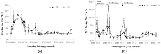 Figure 2 shows the CH4 and N2O flux pattern from paddy soil throughout the rice growth period. The CH4 flux peaked at about 30 days after rice seedlings were transplanted in the two rice systems (Figure 2a), while the N2O fluxes were consistently low while flux peaks were observed mostly after N fertilization, and ER treatment had the exception of some peaks (Figure 2b). Compared with the CK system, the ER system increased the cumulative CH4 emission, GWP, and GHGI by 11.1%, 8.1%, and 14.3%, respectively, while it decreased N2O by 27.2% (Table 5), but not significantly (p < 0.05).