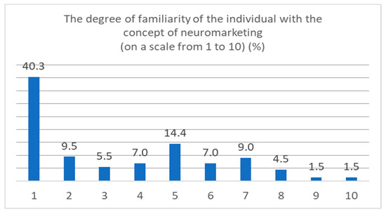 Figure 2), which denoted a very low level of familiarization of the market with the concept of neuromarketing. This conclusion was also supported by the mental associations that consumers made with this concept, as it should be noted that the highest percentage was for those who did not know what the concept of neuromarketing referred to (16.2%), to which we can add the other 9.2% who have made wrong associations. Besides this quarter of the market that was not at all familiar with the concept, we also have 15.1% that explained neuromarketing as being “something related to marketing”. There were, however, also a few correctly made associations with the term neuromarketing—analysis of clients’ response to stimuli (9.2%), identifying influence factors (8.1%), analysis of brain activity (7.4%), and analysis of consumer behavior (3.2%). One last thing to mention is the fact that there are also negative associations, in the direction of manipulating the human brain (4.3%).