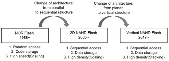 Flash memory, the largest non-volatile memory type in the semiconductor market, was introduced by Toshiba in 1984 [3]. After this introduction, Intel and Toshiba were able to commercialize the NOR (NOT OR) type flash in 1988 and the NAND (NOT AND) type flash in 1989, respectively [3,4]. The main differences between the NOR and NAND flash memories are architectural structure because the NOR provides parallel access and the NAND provides sequential access of data. Since the NOR flash memory is used for the random access of data, it is faster than the NAND flash memory because it provides sequential access to data. However, the structure of the NAND flash is simpler than that of the NOR flash, so it is more convenient and inexpensive to increase its density. Therefore, the NAND type flash is used for the storage of data, and the NOR flash is used for the storage of codes in general [3]; eventually, the NAND flash dominated the flash industry.