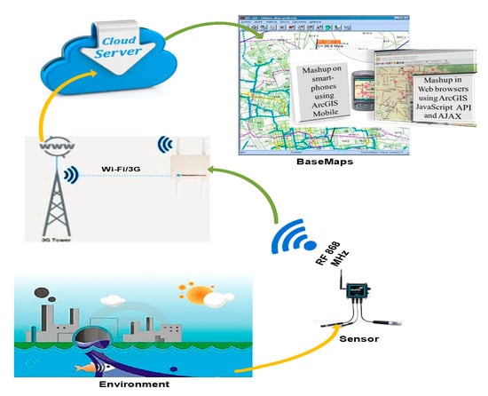 - Fang, S.; Da Xu, L.; Zhu, Y.; Ahati, J.; Pei, H.; Yan, J.; Liu, Z. An integrated system for regional environmental monitoring and management based on internet of things. IEEE Trans. Ind. Inform. 2014, 10, 1596–14605. [Google Scholar] [CrossRef]