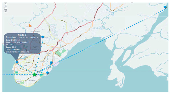 The system was comprised of a Waspmote V1.2 microcontroller board [], water sensors, a SIM-900 GPRS/GSM module, and a GIS for interface and monitoring. The overall system is represented by Figure 5, while Figure 6 presents the GIS Node location for KPI measurement around the Fiji Islands. The SWQMS also has an analog to digital converter (ADC), a data storage card, and a GSM module.