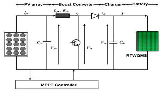 Furthermore, as the setup needs to work for a long time, power preservation is essential. To conserve the power, this system used a sleep mode operation around reading intervals of 1 h. To extend battery life, a rechargeable Lithium-ion battery was used and the power supply was provided by a Photovoltaic (PV) system, as shown in Figure 7, while the specifications of the PV system are given in Table 2. To design a stand for SWQMS, a PV array with two strings characterized by a rated current of 2 A was used. Each string was subdivided into 11 modules characterized by a rated voltage of 1.2V and connected in series. Thus, the total output voltage of the PV array was 13.2 V, and its output had a current of 2 A. The value of the DC-link capacitor was 25 μF, the line resistance 0.001 Ω and inductance was 0.2 μH. The power supply system was simulated and designed under atmospheric conditions, for which the values of solar irradiation and temperature needed to be 1 kWm−2 and 298 K, respectively, to charge a lithium-ion battery of 12 V. The PV system was integrated from the concept of previous research done by references [,].