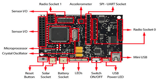 The Waspmote architecture is based on the Atmega 1281, an eight (8) bit microcontroller for the SWQMS. The boot loader binary is executed by this microcontroller, which is stored in the FLASH memory. This enables the main program created by the user to be run. There are seven (7) analog inputs for the sensors which are connected to the microcontroller. Within the microcontroller lies a 10-bit successive approximation ADC. Furthermore, there are several digital pins which can be configured to act as either inputs or outputs when 0 V is low and 3.3 V is high. Figure 8 highlights the microcontroller, sensory sockets, and radio sockets along with other features.