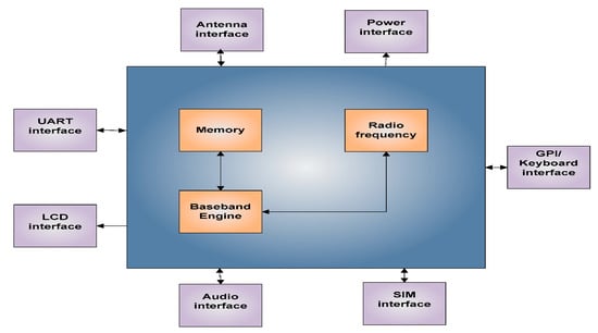 The GSM device uses a sim900 (provided by Simcon) as its baseband engine and as a communication module. It is a quad-band engine working with GSM 850 MHz, EGSM 900 MHz, DCS 1800 MHz, and PCS 1900 MHz. Furthermore, it has very small constructions where the dimensions are 24 mm × 24 mm × 3 mm to keep the design compact. The sim 900 is integrated with TCP/IP protocols, which is one of the most flexible forms of data transmission. Figure 9 presents a block diagram of Sim 900 showing the primary functions which are the radio frequency, baseband engine, and the flash memory along with other interfaces. Four (04) different types of sensors have been utilized for this SWQMS to measure the water quality in this case study, which is detailed later in this section, and the SWQMS setup is shown in Figure 10.
