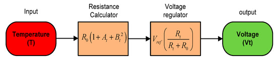 The SWQMS uses a PT1000 sensor for its temperature measurements. The PT1000 sensor generally has a linear relationship over a small temperature range. In this research, the temperature range for sensing is 0–100 °C, which will provide a linear relationship between temperature and resistance as shown below in Equation (1).