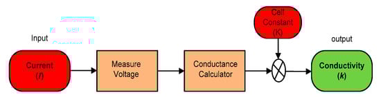 where k = conductivity (S/cm), G = conductance (S), and where G = 1/R and K = cell constant (cm−1). A summarized model of the conductivity sensor is described below in Figure 12.