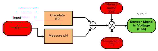 As the voltage produced by the electrodes has a linear relationship to the pH of the solution, at the reference pH of 7, the potential between the electrodes is 0 V. At an acidic or low pH level, the potential between the electrodes is linear. Likewise, at a high pH, the potential between the electrodes will be at the opposite polarity. The overall working principle of the pH sensor can be seen in the following mathematical model shown in Figure 13.