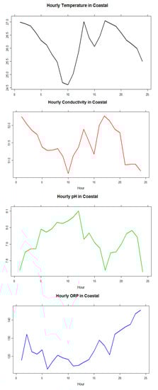 A different set (Node-3; Sigatoka coastal water) of data for all KPIs were analyzed and presented in this section to validate the system reliability and sensitivity. The experiment was conducted over the course of a month. The starting date of the experiment was 7 December 2015 and the experiment were concluded on 6 January 2016. The following graphs in Figure 14 shows the average hourly (from hours 1–24) variations of the values of four KPIs/parameters during the investigation period within an interval of 5 min every hour in a particular day and only average hour readings from one (1) day are shown here as a reference in Table 5.