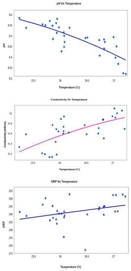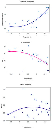 The data highlighted that there were little variations in pH, conductivity, and ORP readings over the 24 h period and therefore it could be concluded that the sensors were reliable. Conductivity values were observed in the range of 50.3–51.95, pH values had the range 8.4–8.7, and ORP was observed in the range of 232–252 mV. These all show signs of healthy water according to research gathered [,,,]. Figure 15 and Table 6 show the temperature relationship with pH, conductivity, and ORP for a particular day, which confirms the trends that they follow a linear positive or negative co-relation inclined with the theories. More specifically, conductivity is strongly positively correlated with temperature in all types (04) of water. pH is strongly negatively correlated with temperature in all types (03) of water, except in creek water. ORP has no significant correlation with temperature except for the creek water in this case study.