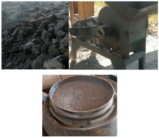 The recycled fine aggregate from the construction waste of HCB was collected from HCB production sites found in the city of Jimma, which is called Degene Tsedale Hebret and Lemlem (DTHL), as shown in Figure 1, to avoid contamination in construction sites such as mortar, gypsum, and painting. The HCB used for this experimental purpose had an age of two months and was stocked to be used in construction. The HCB was processed to get recycled fine aggregate as per the following steps and as per the technique shown in Figure 2.