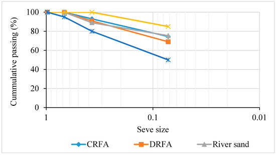From Figure 3, the particle size distribution curve of river sand and both types of RFA was between the upper and the lower limit, which satisfied the ASTM standard requirement. The fineness modulus of the sand varied from fine sand 2.2–2.6, medium sand from 2.6–2.9, and coarser sand from 2.9–3.2. The fineness modulus of both types of RFA was in the range of 2.6–2.9. Therefore, both DRFA and CRFA were medium sand types.