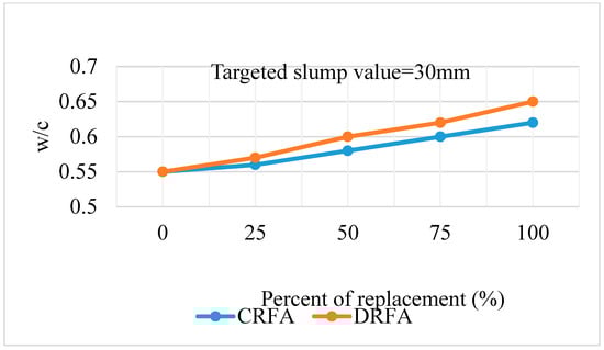 Water/cement ratio: The water/cement ratio varied for each percentage replacement of the CRFA due to the absorption capacity of the CRFA as shown in Figure 4. The amount of water required increased as the percentage of replacement of recycled fine aggregate increased. To maintain the workability of concrete containing recycled fine aggregate, the water/cement ratio ranged from 0.55 for the reference mix to 0.61 for the mix with 100% CRFA. The reason for the increment of w/c was due to the high absorption capacity of CRFA, which was 5.1%. From Figure 1, the water absorption capacity of DRFA (6.84%) [11] was slightly higher than that of CRFA (5.1%). The previous studies also agreed on the high water absorption capacity of the recycled fine aggregate due to the dust and the hardened porous cement mortar adhered to it [4,11,22]. DRFA could have had remaining gypsum, plastering, painting, and ceramics wastes after separation and purification processes were undertaken since the materials were from a demolished student dormitory. The water absorption capacity of recycled fine aggregates was higher than the normal aggregates, and the researcher [23] found that recycled aggregate can have 8–10% water absorption capacity.