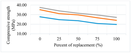 The compressive strength test was performed using 150 ∗ 150 ∗ 150 mm cubes in which the specimens were cast. In a compressive strength test, to be accurate and consistent, replication of the consecutive results was applied by taking three samples for each percentage and each curing period. Figure 6 provides the results of the compressive strength test of reference mixes and mixes with recycled fine aggregate. The compressive strength result of the reference mix sample for the seventh, the 14th, and the 28th days of the hydration period increased from day to day due to the ongoing hydration process. As can be observed from Figure 4, the compressive strength of concrete samples with CRFA had a lower compressive strength value than the control mix. For the 28th day compressive strength, the sample with CRFA was reduced by 9.43% from the reference mix for 25% replacement and by 16.1% for the 50% replacement. Thus, the compressive strength decreased as the percentage of the replacement of the CRFA increased. Additional water was added to the mix due to water required for the compensation of the high water absorption capacity of CRFA. This extra water added to the mix increased the w/c ratio. From a previous study [9], the compressive strength of concrete with recycled aggregate concrete was reduced by 20% compared to the reference mix, and they concluded that this was due to the high amount of absorption compensation water that increased the w/c ratio.