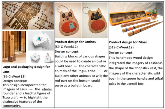 A design course for ‘Culture and Design Communication’ was applied to get students actively involved in this research. Based on community culture as the developmental spindle, a field for a practical creation exercise was provided to encourage learners to present doubts about their assumptions and absorb more knowledge and practical experience to help them re-think the role played by the Penguu indigenous community. This allowed students to listen to the feedback of the indigenous people with different cultures and encouraged students to further understand indigenous Tsou culture and induce multicultural interest. The course content and objectives of ‘Culture and Design Communication’ aim to determine the problems, behavior modes, and communication methods of people from regions with distinct cultures, as well as unique codes, beliefs, norms, and values [12]. Design is a medium between culture and industry as well as a strategy. Learners have to understand distinct cultures and respect and comprehend different cultural traits, dilemmas, and demands to express the design concept [6]. Using the practice of social responsibility through the design curriculum, the indigenous cultural trait problems, behavior modes, and communication methods of the Tsou Penguu Community were discovered to assist in the sustainable development of the indigenous cultural industry and solve community problems so that students could understand indigenous culture and further respect it. The discussion in these two paragraphs forms the first portion of the conclusion.