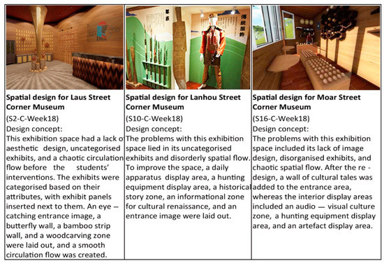 The university’s social responsibility was fulfilled through the design course of ‘Culture and Design Communication’ in this study, and, according to the above-mentioned course content and objectives, six core curriculum development dimensions are concluded. ‘Problem introduction and planning’, ‘intervention into fields’, and ‘intervention of roles’ correspond to the design concept of Brown [8], the executive of IDEO, a famous professional design company, showing that the value of design exists in the positive intervention and dialectic of design thinking and problem-solving. Design needs the intervention of people, problems, and environments to discover the existence of problems through interaction. Design, with the inspection of personal design ideas through problems and the innovative discovery of ‘solutions’, could be used as a strategy to solve social problems and achieve social practice and innovation. These three dimensions also correspond to Yamazak [16], who showed that ‘design’ is a process and method used to solve problems, where people are connected in the design process, and making plans and using design to solve social (community) problems are the spindle for achieving the value of social practice and social innovation. Aligning with Costandius’ research [19], art (design) is, in fact, an effective medium to enhance social responsibility.
