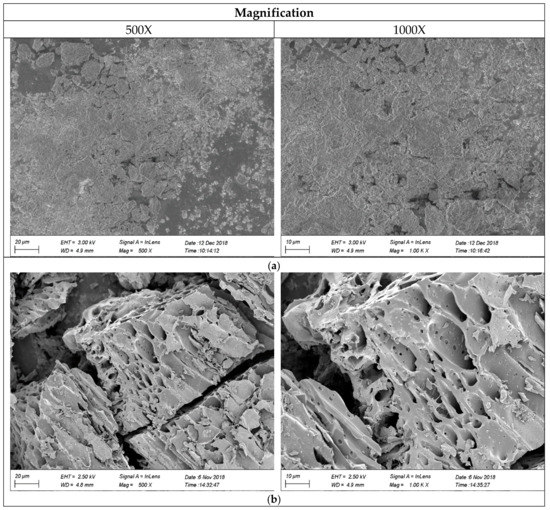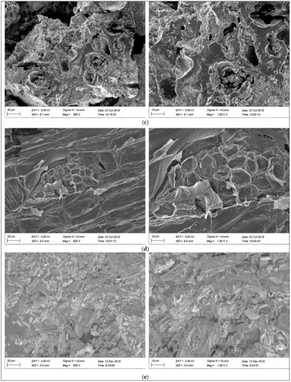 Figure 2a–h shows the SEM micrographs of biochars at two magnifications (i.e., 500×, 1000×). SEM images of pig manure biochar (Figure 2b) display a large porous and foam-like structure (but the greater size particles may result in lower surface-to-volume ratio in the biochar). Cedar wood biochar (Figure 2d) shows a layered structure in accordance with water hyacinth and algae biochar (Figure 2e,f) at 300 °C. The planar cleavage and smoothened surface of the water hyacinth and algae biochar may be due to volatilization of all hydrocarbons. The effect of temperature can be clearly seen in biochars produced from water hyacinth (Figure 2e–g) and Sargassum horneri algae (Figure 2f–h). As observed, the rise in temperature will result in carbonization of biomass, that will in turn result in a release of volatile matter from char generating higher pores and surface area. Thus, the biochar produced at 600 °C can be seen to be further inerratic and flat, in comparison to the biochar produced at lower temperature, with several micro pores on the surface, demonstrating an increase in surface area and thereby providing additional sites for adsorption, nutrients, and water retention. Rice straw biochars (refer Figure 2c) have a small pyramidal (hollow and porous) structure, with a high surface-to-volume ratio making it suitable for high adsorption.