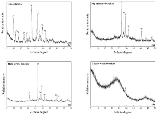The XRD results of (a) Clinoptilolite; (b) Pig manure biochar; (c) Rice straw biochar; (d) Cedar wood biochar; (e) Sargassum horneri (300 °C); (f) Sargassum horneri (600 °C); biochar; (g) Water hyacinth (300 °C); (h) Water hyacinth (600 °C) (Q = Quartz, C = Calcite, S = Sylvite, W = Whitlockite).