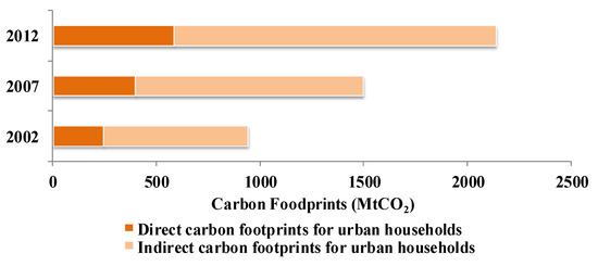 Figure 1 showed that the total carbon footprints of China’s urban households were 941.37 MtCO2, 1498.11 MtCO2 and 2139.50 MtCO2 in 2002, 2007, and 2012, respectively. It indicated that the total carbon footprints rose by 127.28% from 2002 to 2012. The direct urban household carbon footprints were 245.70 MtCO2, 398.32 MtCO2 and 585.63 MtCO2, respectively, in 2002, 2007, and 2012, and the indirect urban household carbon footprints were 695.67 MtCO2, 1099.79 MtCO2 and 1553.87 MtCO2. Even though the direct carbon footprints of urban households continued to go up every year, they still trailed far behind the indirect carbon footprints, which was an average of approximately 2.75 times higher than the direct ones. It signified that indirect carbon footprints played a primary role in the total urban household carbon footprints in China, and the concentrated mitigation should be facilitated on the indirect carbon footprints.