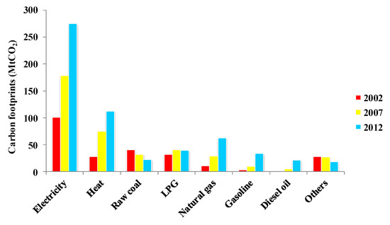 Figure 2 indicated the direct urban household carbon footprints in 2002, 2007, and 2012, while Figure 3 depicted the corresponding components in 2002, 2007, and 2012. With regard to energy consumption structure, raw coal, gasoline, diesel oil, LPG, natural gas, heat, and electricity were the main energy sources accounting for about 90% of direct urban household carbon footprints. It was clear that electricity was the main contributor to the direct urban household carbon footprints, accounting for over 40%. The carbon emissions from electricity increased from 100.32 MtCO2 in 2002 to 274.56 MtCO2 in 2012. The carbon emissions of heat increased around three times from 28.14 MtCO2 to 112.36 MtCO2 during the ten years. Such rapid growth was mainly caused by the expanded areas of central heating, which has become the main mode of heating in cities. From 2002 to 2012, the use of raw coal decreased by 43.44%, and the proportion of direct carbon footprints declined from 16.33% to 3.88%. While the use of natural gas grew significantly by 461.94% and became the third emitter in 2012, accounting for 10.72% of the total direct carbon footprints. In addition, the carbon emissions of gasoline and diesel oil in 2012 were more than 10 times as much as in 2002 (from 5.46 MtCO2 to 55.51 MtCO2 together), which mainly caused by dramatic demand of gasoline and diesel oil meeting the demand of growing vehicles.