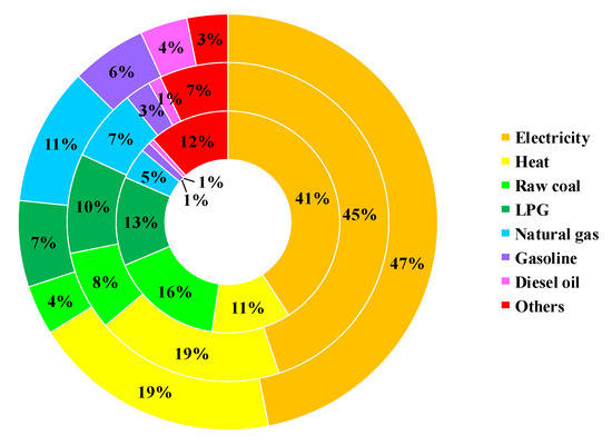 The direct carbon footprints of urban households refer to the carbon emissions caused by direct consumption of energy in domestic activities, such as cooking, heating, cooling, and mobility. Direct urban household carbon footprints can be calculated by Equation (1):