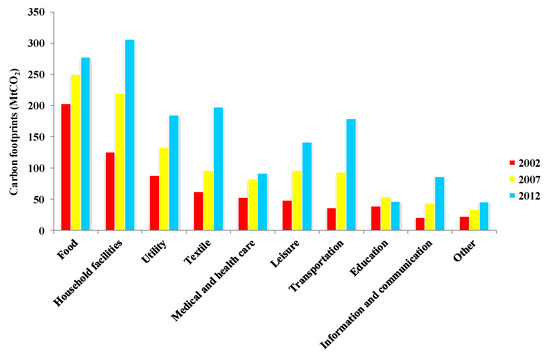 In addition, changing consumption structure also contributed to mitigating carbon footprints of urban households. The contribution of consumption structure to increasing carbon footprints was 16.56% during 2002–2007, while it slightly decreased to 15.06% during 2007–2012. The changes in consumption structure of five categories, including “food”, “utility”, “medical and health care”, “education”, and “other”, had a negative effect on carbon footprints. The negative effect on these categories was due to the decreasing proportion of the total consumption expenditures from 2002 to 2012. The same phenomenon could also be found among industrial sectors. Therefore, urban households should reduce the consumption proportion of high-intensity goods and transform consumption behaviors to low-intensity products.
