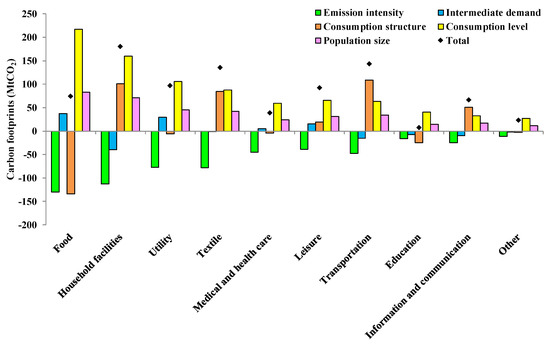 The impact factors influencing the increasing urban household indirect carbon footprints were analyzed by SDA. As shown in Equation (5), the indirect urban household carbon footprints can be decomposed into three driving forces: Emission intensity , intermediate demand (), and the urban household consumption expenditure . For deeper study, we further broke urban household consumption expenditure into consumption structure , per capita consumption volume and urban population . Hence, the indirect urban household carbon footprints can be expressed as . The change in from base period 0 to target period t can be decomposed into the sum of contributions of driving forces, shown as Equation (8):