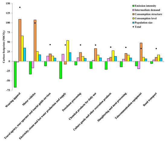 As mentioned in Section 3.1.3, the carbon footprints from ten industrial sectors had the greatest contribution to the growth of carbon footprints from 2002 to 2012. Thus, it is necessary to further decomposed the carbon footprint increment in these sectors. In contrast to consumption categories, the increment of carbon emissions of these sectors mostly contributed by consumption structure, in addition to “electricity, steam and hot water production and supply”, “culture goods and other recreation products” and “road transport”, the main positive impact of which was consumption level and responsible for 53.93 MtCO2, 27.69 MtCO2, and 16.77 MtCO2, respectively (see in Figure 7). The greatest contribution of consumption structure was 109.16 MtCO2 in “wearing apparel”, followed by 107.42 MtCO2 in “motor vehicles” and 47.64 MtCO2 in “telecommunication equipment”. The only one negative effect of consumption structure was presented in “electricity, steam and hot water production and supply” with −7.67 MtCO2. Similar to the consumption categories, the reduction in carbon emissions of these sectors mostly contributed by emission intensity except for “telecommunication equipment”, the main negative impacts of which was intermediate demand and responsible for −19.26 MtCO2. The greatest contribution of emission intensity was −67.70 MtCO2 in “wearing apparel”, followed by −44.83 MtCO2 in “electricity, steam and hot water production and supply” and −33.40 MtCO2 in “motor vehicles”.