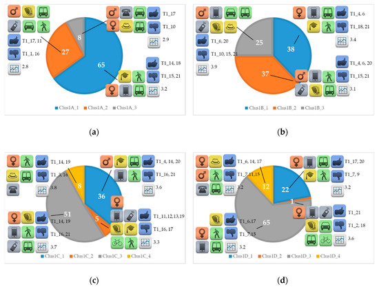 Graphical representation of the characteristics of the clusters obtained with the approach Clus1 for: (a) city A; (b) city B; (c) city C; (d) city D.
