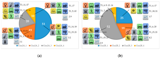 Two different approaches are proposed in this paper. In the first case, only the socioeconomic and travel-related variables were used to identify the clusters (Clus1 in the following), while in the second one the quality indicator binary features were added too (Clus2 in the following). The results obtained in both cases are presented, seeing how the variables available behaved in the clusters derived by the algorithm. Once the various clusters were identified, a specific analysis was proposed, investigating the characteristics of the travellers belonging to them, as shown Table 4 and Table 5 for Clus1 and Clus2, respectively. Different groups of users dominated in each city and it is interesting to notice that very similar features were found when comparing the test sites. Figure 1 and Figure 2 present the partition of travellers in each location through pie charts, while specific icons visually represent the characteristics of the different clusters.
