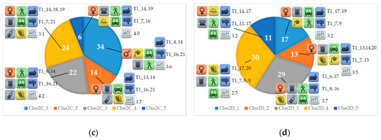 Graphical representation of the characteristics of the clusters obtained with the approach Clus2 for: (a) city A; (b) city B; (c) city C; (d) city D.