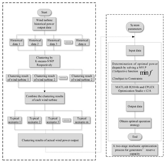 In this section, we present a two-stage stochastic optimization model that mainly focuses on optimizing the dual-side reserve capacity of the power system to improve wind power consumption. In the first stage, the wind power output is predicted to determine the system backup capacity that needs to be generated in the second stage. In the second stage, the wind power output is clustered according to historical meteorological data by the K-means-NWP method in order to simulate the wind power output on the next day, then according to the error between the wind power output simulation value and the actual value. The remaining reserve capacity in the day-ahead phase can be utilized to balance the error.