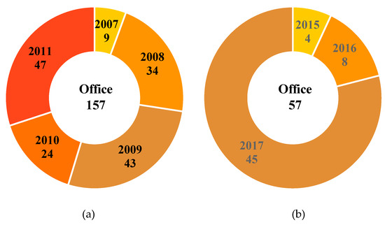 - Changes in the design of office buildings were evaluated by analyzing the statistical values of three design elements—building form, window systems, and U-values—for two periods: 2007–2011 (Group A) and 2015–2017 (Group B). Among the results, U-values showed the greatest variation, and WWR in relation to window systems shifted considerably. Between the two periods, building forms have become thinner and elongated due to changes in aspect ratio.