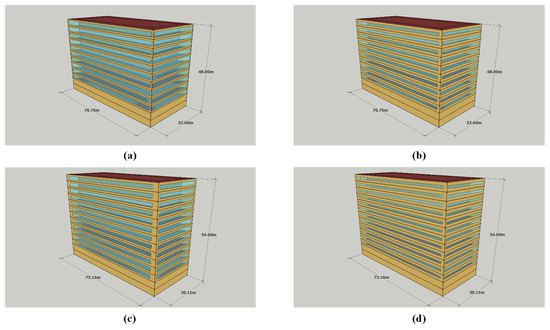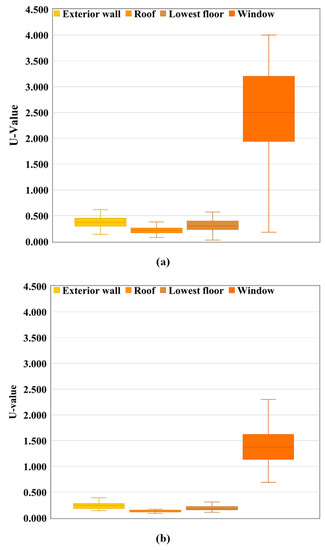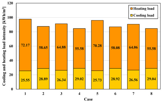 - After a reference building for each of the three elements was developed, eight case studies were performed to analyze the various effects of changes in the elements compared to the reference building (i.e., Case 1), which contained elements characteristic of older buildings (i.e., Group A). Among the results, although the cooling load increased, the total energy load decreased due to the large reduction in the heating load.