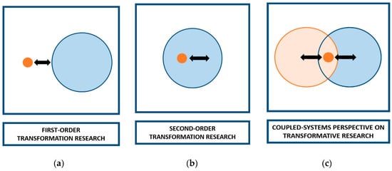 In a recent work, Fazey et al. [] refer to such transformation research and explore a characterization of first-order (‘what?’) and second-order (‘how to’) approaches. While first-order research is concerned with understanding the mechanisms of societal transformation, and generally considers researchers to be rather independent observers, second-order approaches aim to contribute to societal transformation through research as an intervention and acknowledge that the researcher is part of the system she aims to transform. Such transformative second-order research, according to Fazey et al. [] (p. 54), “includes mode 2, transdisciplinarity, post-normal, participatory, sustainability science, and action research”. Though it is increasingly recognized that such approaches might contribute effectively to societal transformations by generating societal impact [], doing transformative research is not a straightforward endeavour and involves many challenges. For transformative second-order research, the challenges are especially problematic and relate to R&I processes, as well as to the associated systemic environments in which these processes are embedded [,,,]. Surprisingly, although scholars often emphasize the challenges they encounter in transformative efforts, they largely ignore the systemic nature of these challenges and do not provide systemic approaches to tackle them. We posit that if R&I is to live up to its full potential as a catalyst for food systems transformation, the challenges of doing second-order research need to be resolved (see also []). Henceforth, the goal of this conceptual paper is to develop an action-oriented approach to tackling those challenges by explaining ‘how to do the “how to”’—which we call a coupled-systems transformation approach.