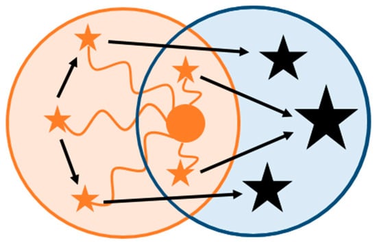 Schematic depiction of the dynamics of a coupled-systems approach: a cross-boundary innovation (orange dot) located at the boundaries of the R&I system (orange circle) and the food system (blue circle) identifies and intervenes on chains of leverage points in R&I systems (orange stars) that aim to change the inter-systemic interactions so that R&I systems can more effectively contribute to food systems transformation (black stars).