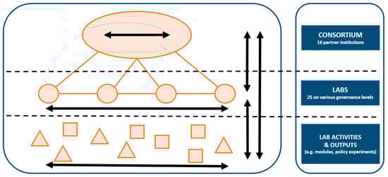 The main loci of intervention within the project are 25 labs, on national and regional/local levels. These labs build on the concept of living labs. While acknowledging that there are many views on what exactly constitutes a living lab [,], we extrapolate our approach to living labs from Bergvall-Kårrborn et al. [] (p. 9): that they facilitate “open and distributed innovation processes engaging all relevant partners in real-life contexts, aiming to create sustainable values”. There are many different kinds of ‘open innovation networks’ [,] that share the common characteristics of (1) involving diverse actors as co-creators on equal grounds and (2) experimenting in real-world settings []. The FIT4FOOD2030 project has various kinds of labs, which were established after multiple open calls and selected for their innovative capacity and their motivation to engage stakeholders in order to contribute to transformation. The labs serve as couplings between food systems and R&I systems operating at different levels and explicitly link functionalities, structures, and actors. Therefore, different kinds of labs work on distinctly different sets of leverage points and take different organizational shapes [,].