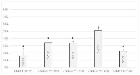 Store shelf study: Trading Partner Alliance (TPA) adherence by store, summer 2019. Error bars depict 95% confidence intervals. Adherence is significantly different across stores (χ2(4) = 192.8, p < 0.001). Chains sharing the same lowercase letter are not significantly different from one another via pairwise chi-square tests.