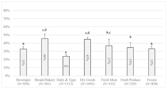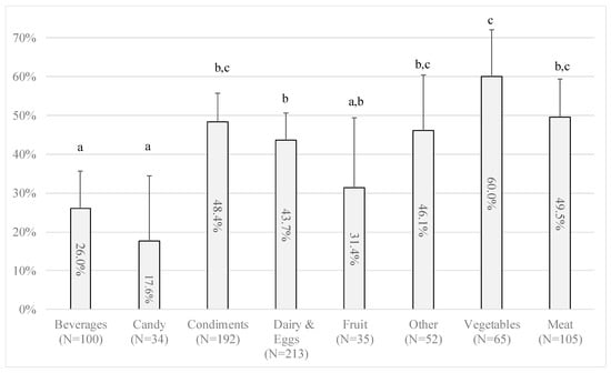 Store shelf study: TPA adherence by food category. Error bars depict 95% confidence intervals. Adherence is significantly different across categories (χ2 (6) = 148.1, p < 0.001). Categories sharing the same lowercase letter are not significantly different from one another via pairwise chi-square tests.