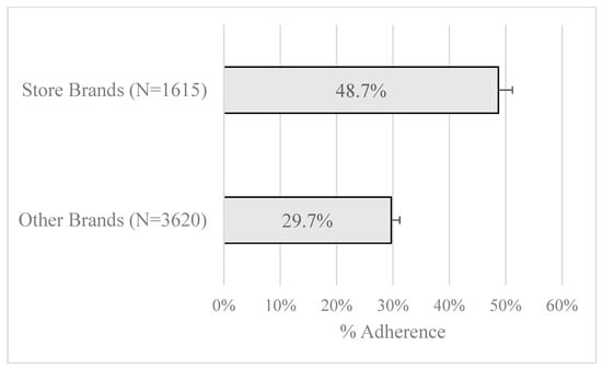 Label adherence: store brands vs. other brands. Error bars depict 95% confidence intervals. Adherence is significantly different between brand types (χ2 (1) = 176.6, p < 0.001).