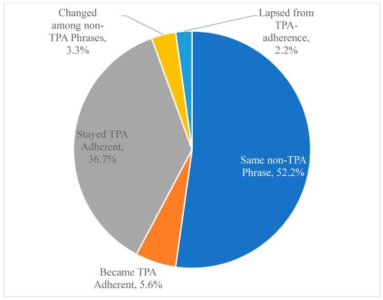 The changes in date label phrases among the 90 products observed in both autumn of 2018 and summer of 2019 are summarized in Figure 6. Most products retained the same label phrase between the two observation periods (88.9%) with 52.2% keeping the same non-TPA-endorsed phrase and 36.7% keeping the same TPA-endorsed phrase. A small number of products switched to a TPA-endorsed phrase from another phrase (5.6%), while 2.2% reverted from a TPA-endorsed phrase to a non-TPA-endorsed phrase for a net improvement in TPA adherence of 3.4% among these 90 products between the autumn of 2018 and the summer of 2019. About 3% switched among non-TPA endorsed phrases.